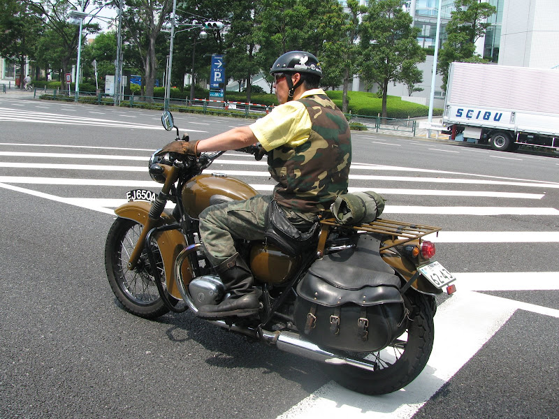 途中並んだ自衛隊仕様メグロ風バーチカルツイン。KAWASAKIW650でしょうか。それともロシア製か中国製?