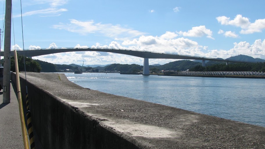 ちょっとおおげさと思われるくらい高い浦戸大橋です。のぼりもきついですが下りがすごい急坂です、